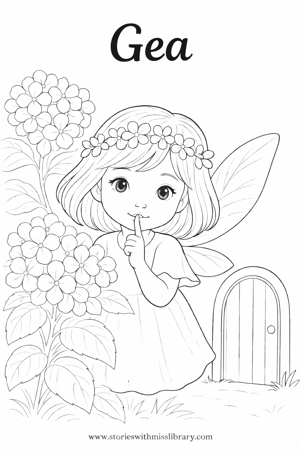 Far away in Mother Goose Land, nestled between the petals of a hydrangea bush, lives a tiny fairy named Gea. She has shimmering blue hair, sparkling blue eyes, and wings with a soft blue glow, like morning dew on flower petals.